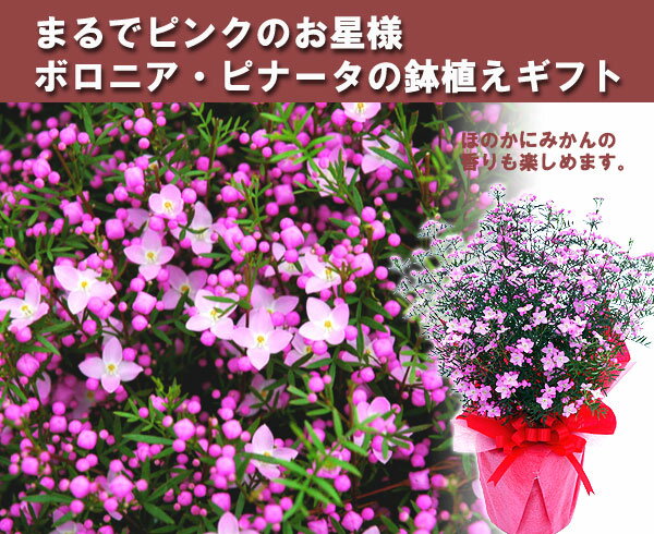 【商品内容】 ・ピンクのお星様の木、ボロニアピナータ鉢植ギフト・・・・5号鉢 高さ約30cm ※鉢植のお花になります。開花状態やラッピングは写真と多少異なる場合がございます。【送 料】 こちらは、送料無料商品です。 ※冬期は、北海道へのお届けは、対応できない場合がございます。【お届けについて】 お届け期間3月10日から14日の間 配達希望日:対応可能 ※ご注文時備考欄にお届け希望日をご記入ください。時間帯も対応いたします。 【同梱包について】 他の商品と同梱包はできません。 FleurTown吉本花城園【お休みについて】 ※通常、土日祝祭日はお休みをいただいております。メールでのお返事やすぐの